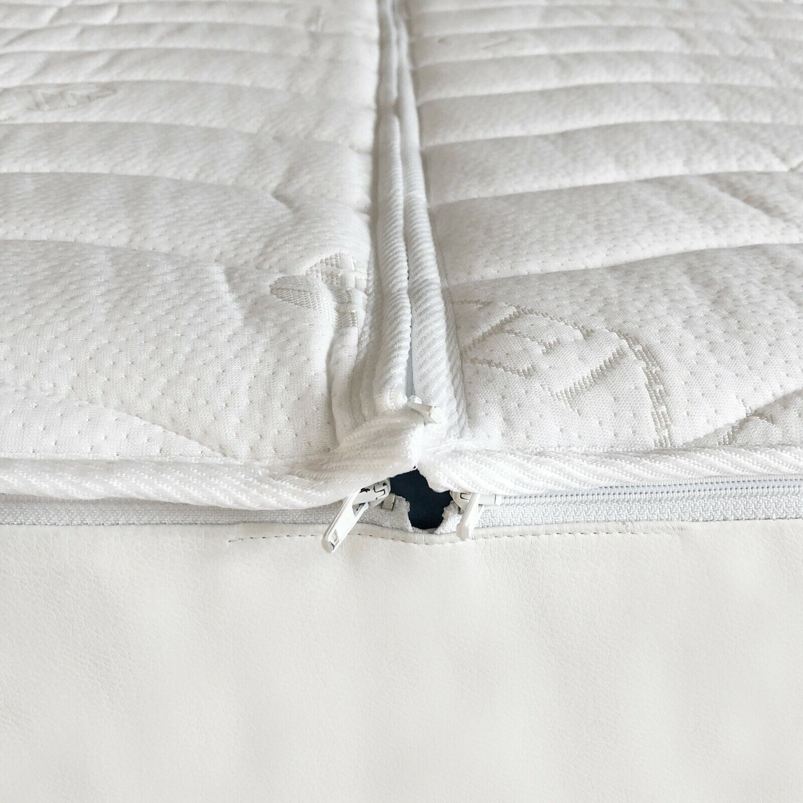 Die Unter- und Oberplatten werden durch einen durchgehenden Reißverschluss miteinander verbunden. Diese Oberplatte ist ab einer Breite von 160 cm zusätzlich mit einem Mittelreißverschluss ausgestattet. Durch diese Teilung passen die beiden Einzelteile der Oberplatte vom Volumen her in eine handelsübliche Waschmaschine, so das Ihnen ein aufwendiges Reinigen in der Wäscherei erspart bleibt.