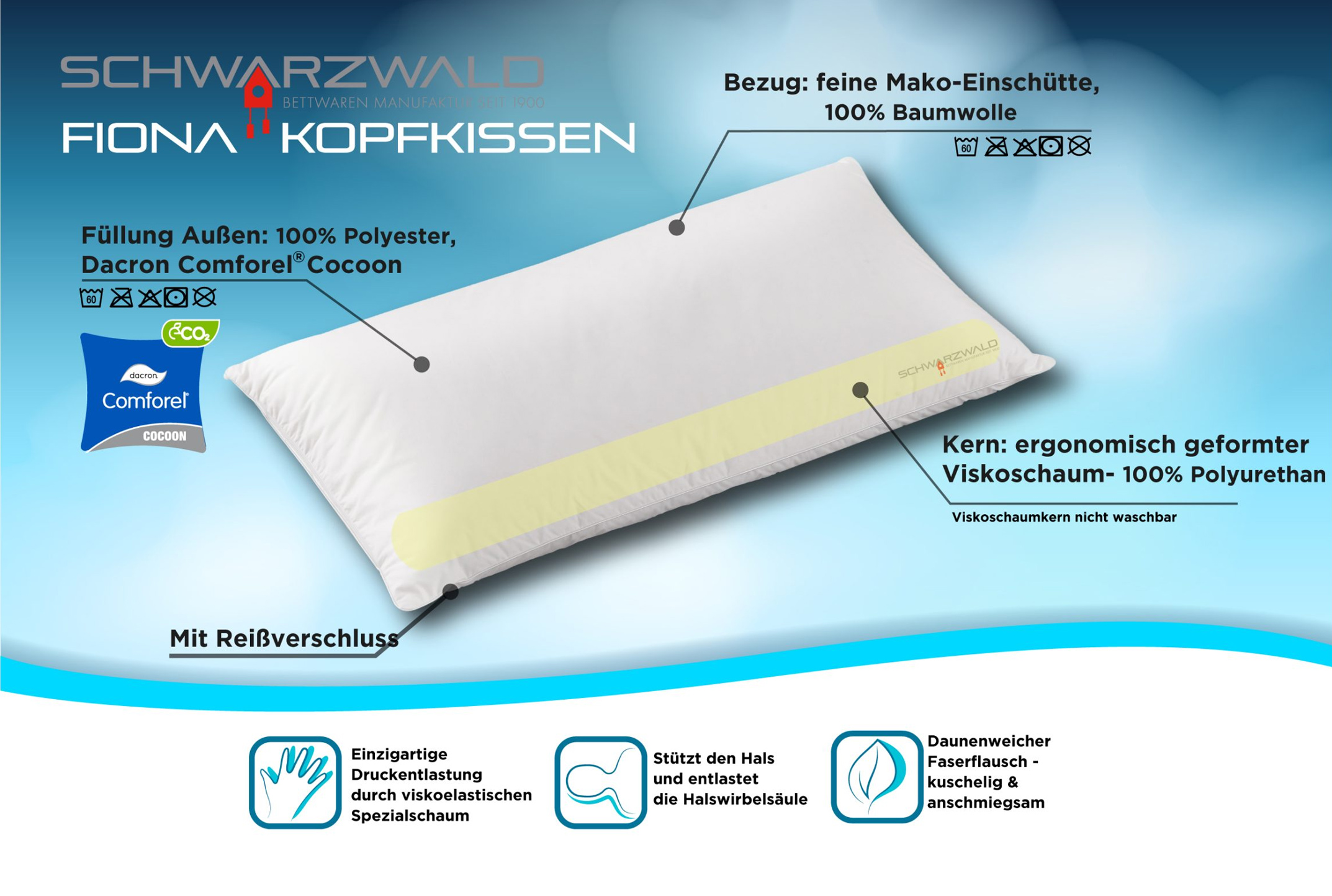 Unsere Schwarzwald-Kollektion entstand aus der Verbundenheit zu unserer Heimat. Seit 1965 produzieren wir an unserem Standort in Lörrach am Rande des wunderschönen Schwarzwalds. Das „Viola“ Kissen ist ein besonderes Nackenstützkissen, welches aus zwei Kammern besteht. Um den Hals optimal zu stützen, befindet sich in der unteren Kammer des Kissens ein viskoelastischer Spezialschaum (100% Polyurethan). Die obere Kammer des Kissens wurde mit den daunenweichen Comforel® Cocoon Fasern (100% Polyester) gefüllt. Der feine Baumwollbezug (100% Baumwolle) sorgt zusätzlich für ein angenehm weiches Liegegefühl. Erhältlich ist dieses Kissen in der Größe 40x80cm.