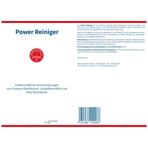 Der Power Reiniger ist ein kraftvoller Reiniger, der hartnäckigste Verschmutzungen, wie Fette, Öle, Ruß, Nikotin, Rauch, und Wachsrückstände effektiv entfernt. Materialschonend ist die Oberfläche im Handumdrehen gereinigt.