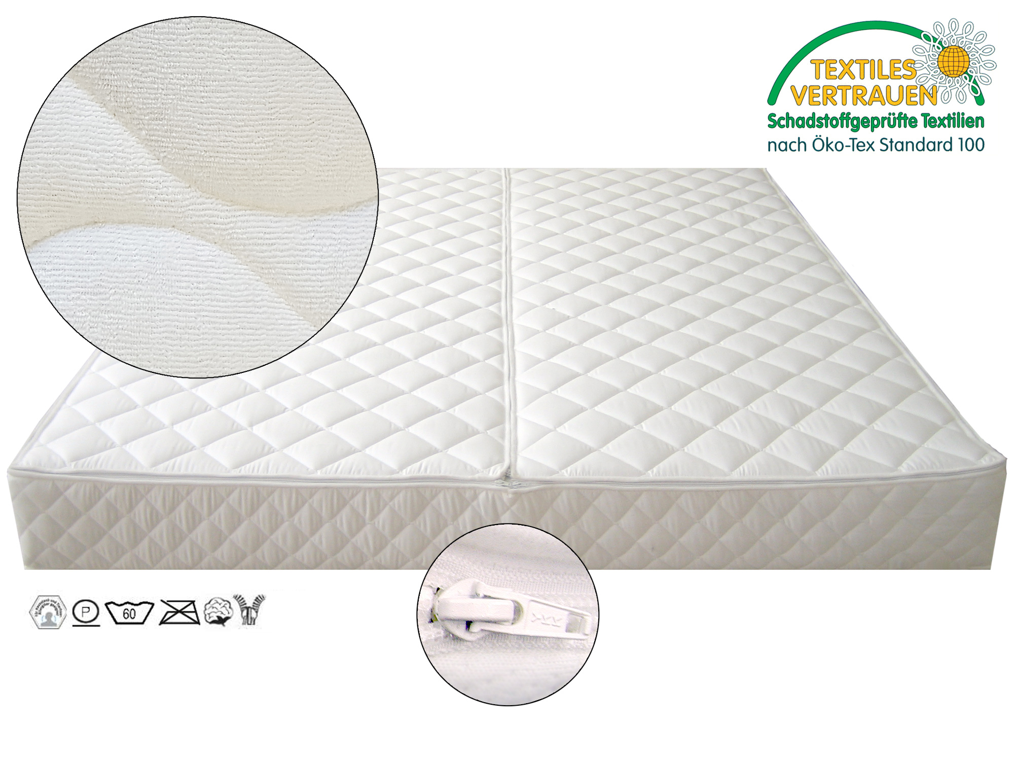 Die Unter- und Oberplatten werden durch einen durchgehenden Reißverschluss miteinander verbunden. Diese Oberplatte kann ab einer Breite von 160 cm zusätzlich mit einem Mittelreißverschluss bestellt werden, (Aufpreis). Durch diese Teilung passen die beiden Einzelteile der Oberplatte vom Volumen her in einer handelsüblichen Waschmaschine, so das Ihnen ein aufwendiges Reinigen in der Wäscherei erspart bleibt.